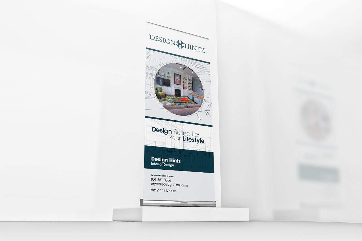 Roll up banner design for an interior design company. My client wanted an advertisement that showcased one of their interior designs. I utilized some of her architectural drawings to give the banner some texture while showing off some more work.